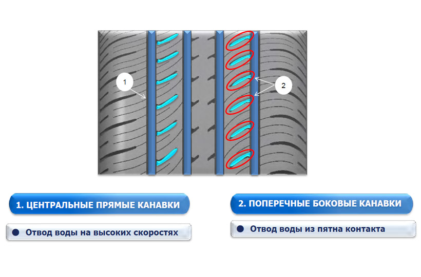 Четыре больших продольных канавки изогнутой формы, превосходно отводят излишки воды повышая сопротивление к аквапланированию.