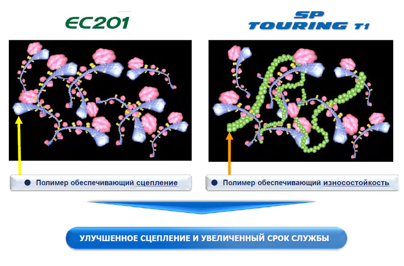 Специальные компоненты резиновой смеси использованные при производстве Dunlop SP Touring T1 повысили износостойкость на 10% и улучшили управляемость на влажной поверхности, а использование полимеров нового поколения позволило повысить сопротивляемость абразивному износу и механическому воздействию.